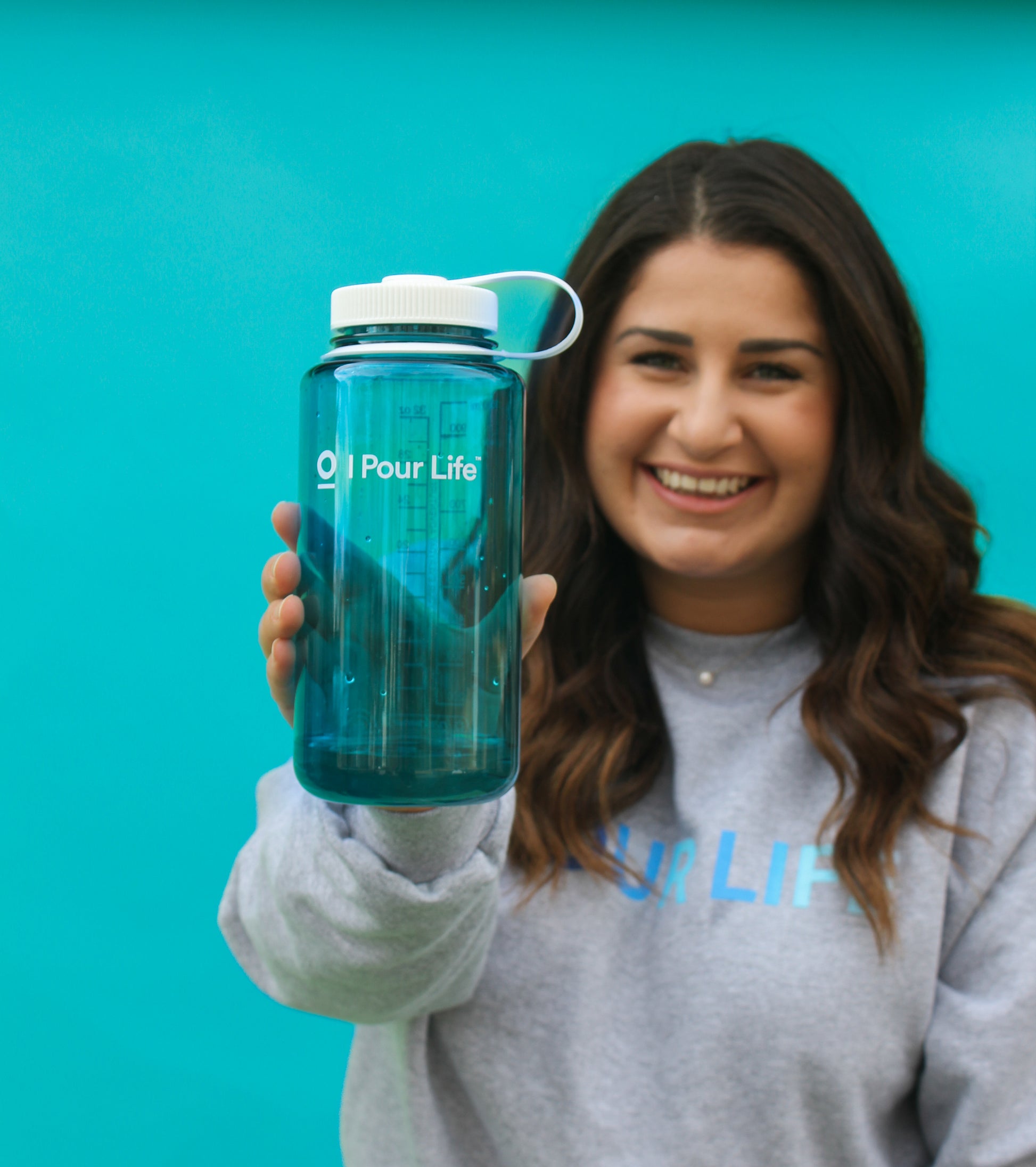 These teal blue I Pour Life Nalgene water bottles are 32 oz. Each purchase will support pouring life into at-risk and foster youth.